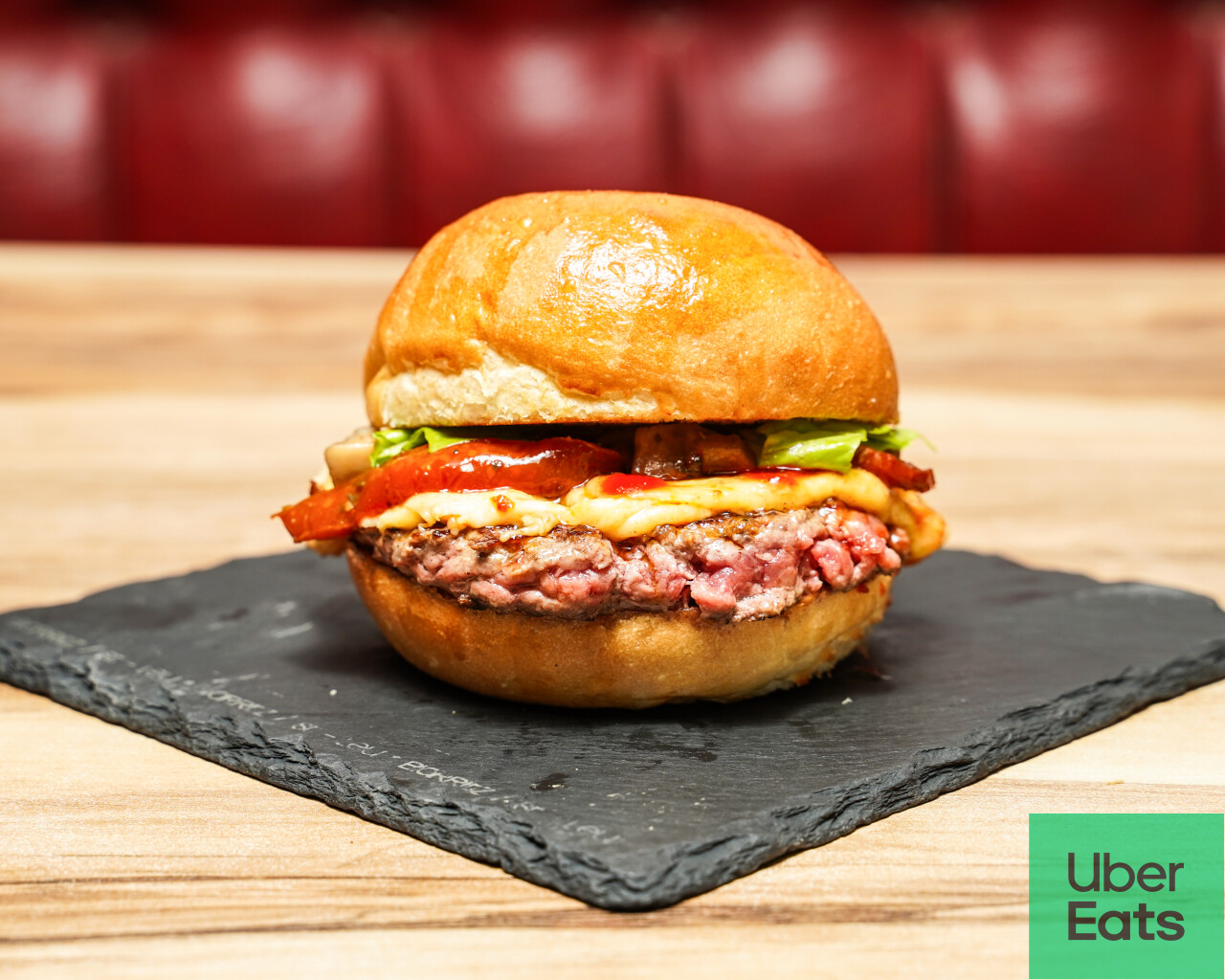 Steak boeuf ou veggie bio, Fourme de Montbrison, tomates confites, champignons sautés, confiture de piment d’Espelette (little spicy), salade, sauce maison.
