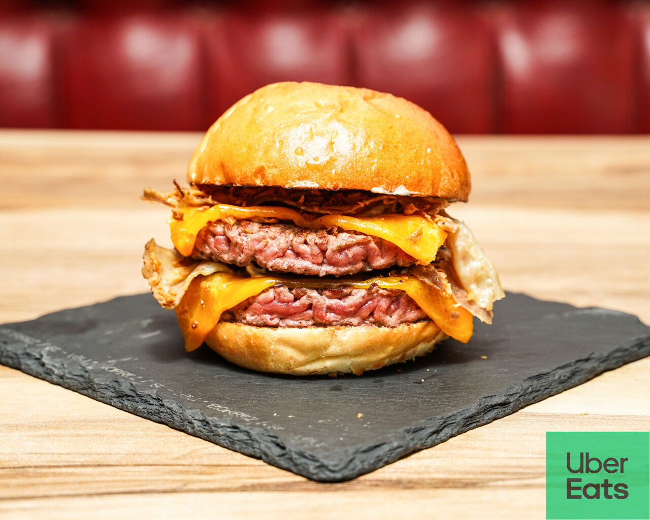Steak boeuf x2, cheddar x4, bacon Ibaïama*, oignons crispy, sauce maison